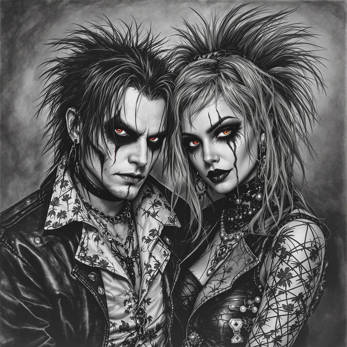 This image shows an 80's punk vampire couple in a family portrait. The hyperdetailed charcoal drawing captures their rebellious style and gothic aesthetic.