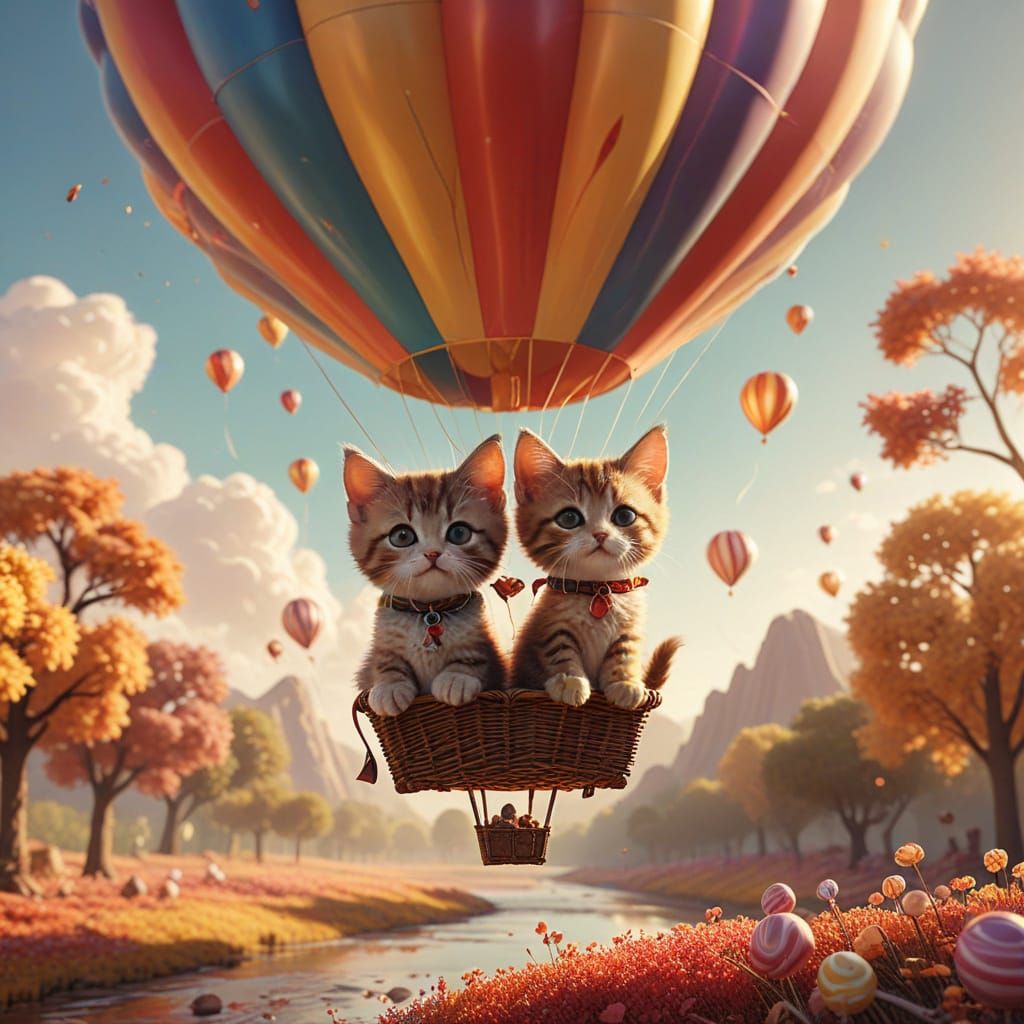 A delightful cartoon image of two kittens in a hot air balloon soaring over a candy land. The scene is rendered with bright colors, soft textures and warm lighting.