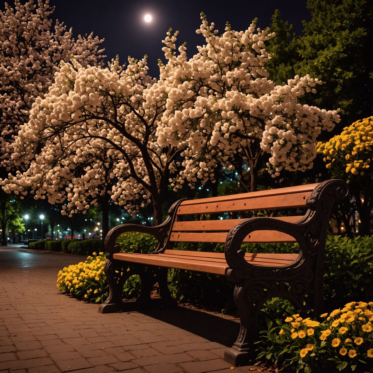 This image captures a serene park bench surrounded by vibrant flowers under the soft glow of the full moon, with intricate details and high contrast, evoking a cinematic and atmospheric mood.