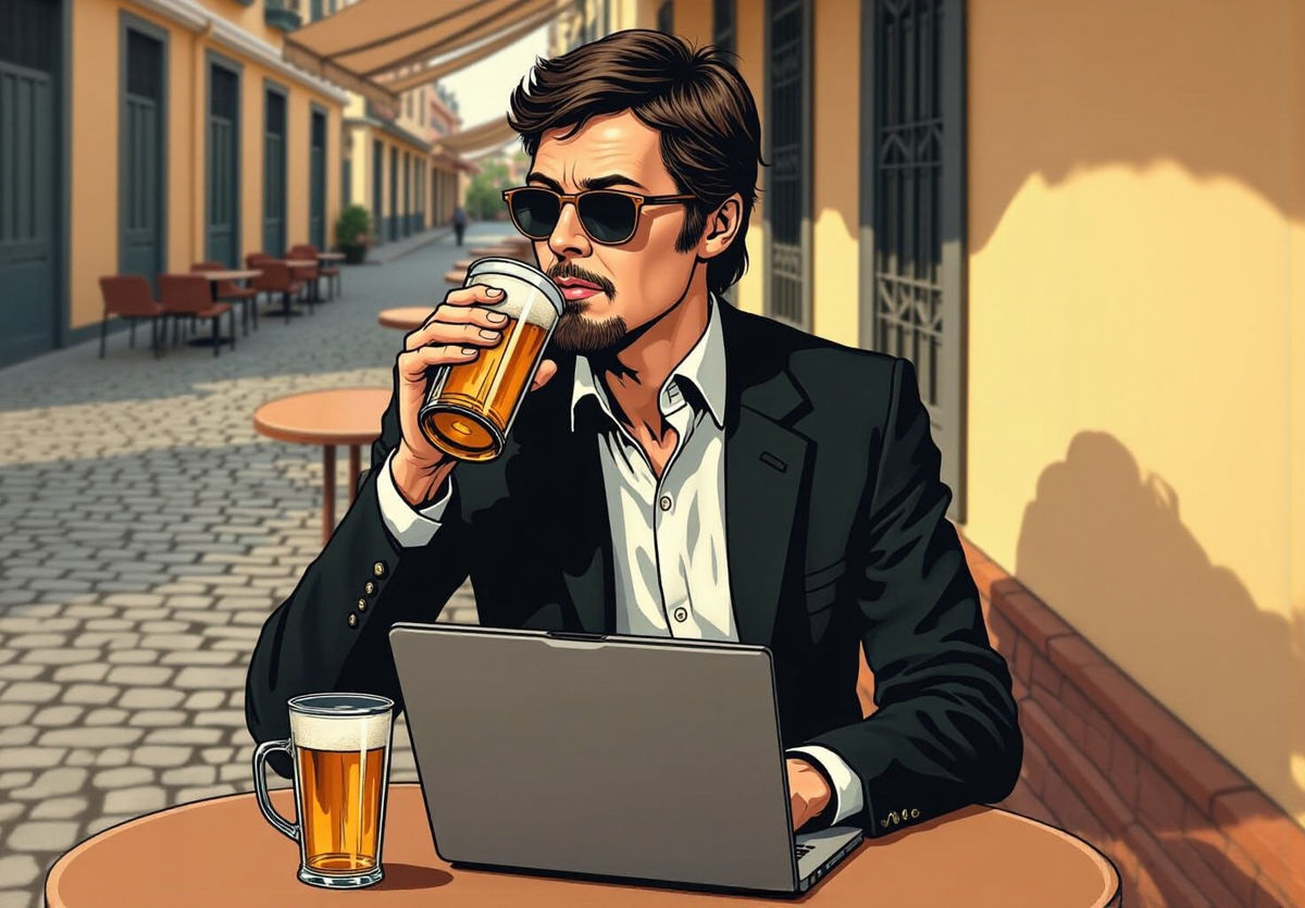 A 1950s comic book style illustration of a man resembling Paul McCartney enjoying a beer at an outdoor cafe in Europe. He has a laptop with him in this vintage comic art.