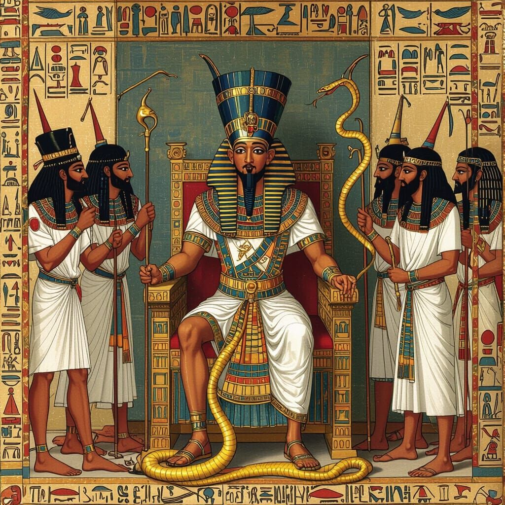 A striking picture of Pharaoh in golden regalia seated on a throne. Scribes surround him as Moses and Aaron stand before him with staffs transforming into snakes. The image is reminiscent of illuminated manuscripts.