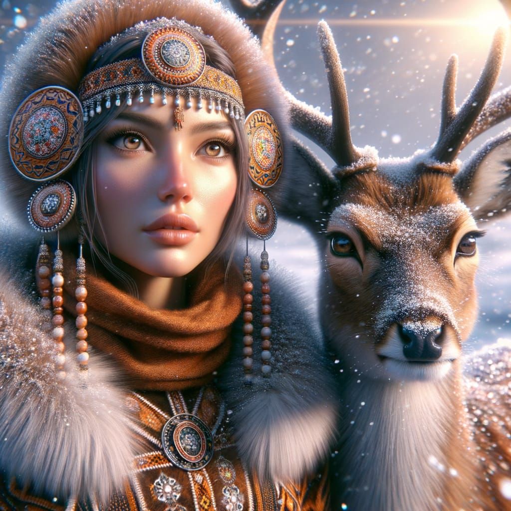A striking picture of a Chukchi woman and deer in a tundra landscape on a sunny winter day. She wears traditional clothing with arctic fox fur and beaded ornamentation, rendered with dramatic, vivid detail.