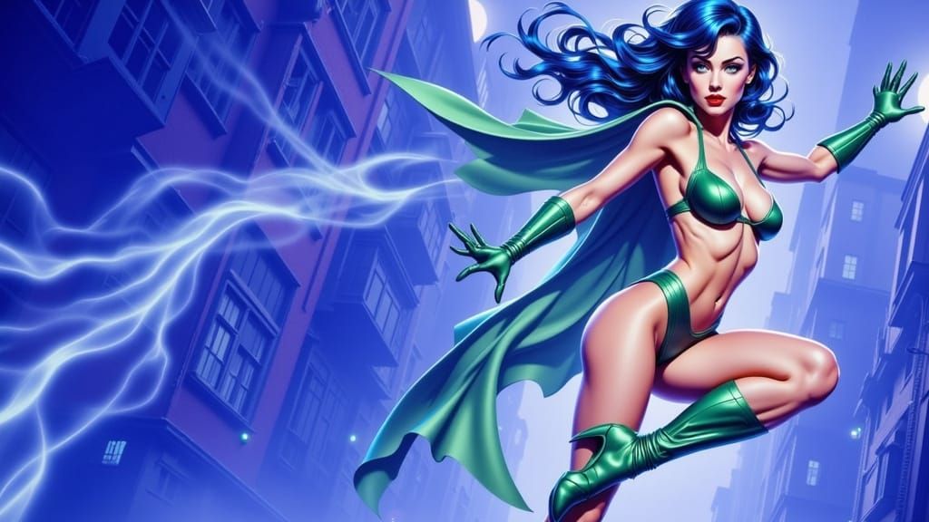 A hyperrealistic image of Phantom Lady in a sleek black costume, standing in a dark alleyway. The scene blends cinematic realism with comic book aesthetics, emphasizing intricate textures and shading.