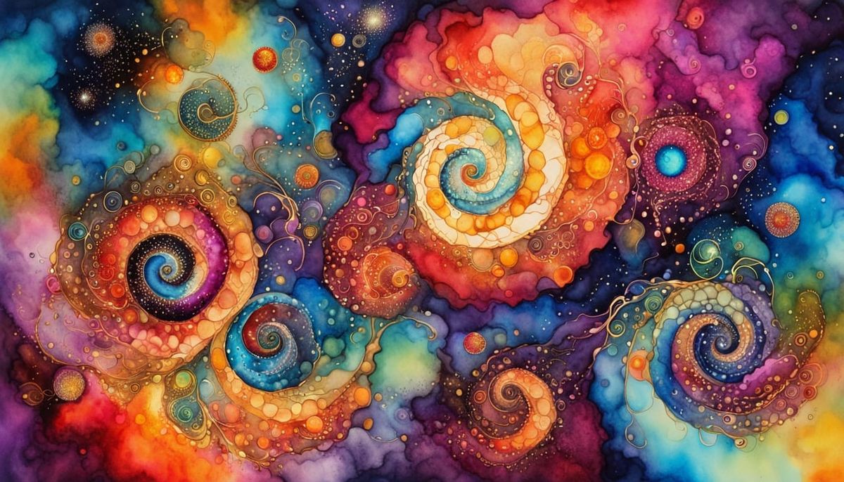Alcohol ink watercolor. A vibrant, energetic microbe swarm, depicted as tiny, glowing celestial spirals, dancing in a swirling vortex of cosmic dust and nebulae. Fluid ink blending, bright and saturated colors, abstract patterns. A sense of movement and light, ethereal glow, cosmic dance, high detail, ...