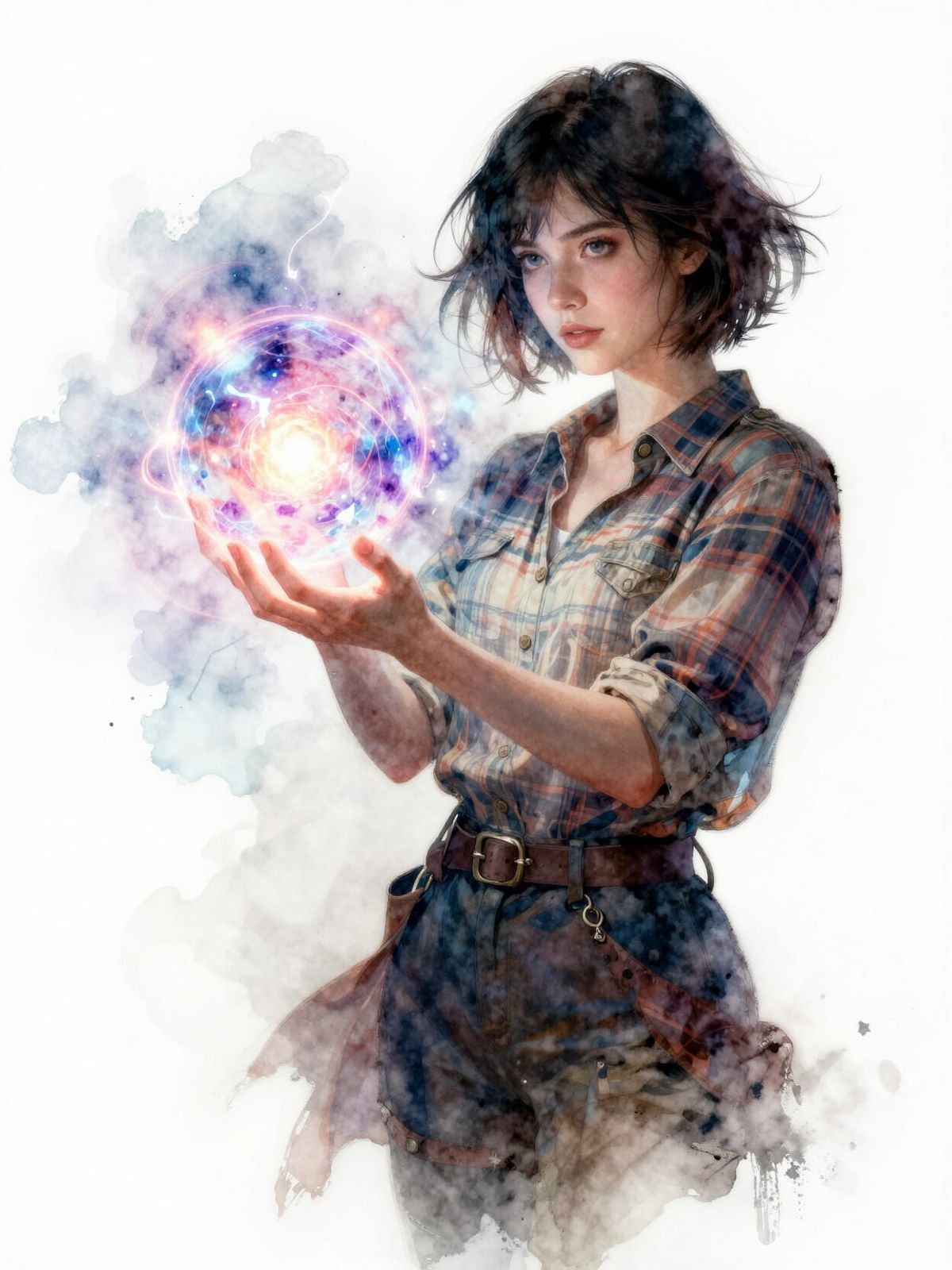 This image features a beautiful technomage girl with short dark hair, holding a glowing magic ball. Created in a multi-layered watercolor style with sfumato and realistic details, it evokes fantasy and adventure.