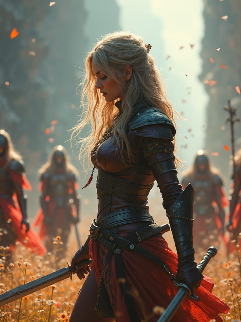 This image shows a stunning female warrior standing tall, her swords shining brightly as she prepares for battle in a mystical, other-worldly landscape