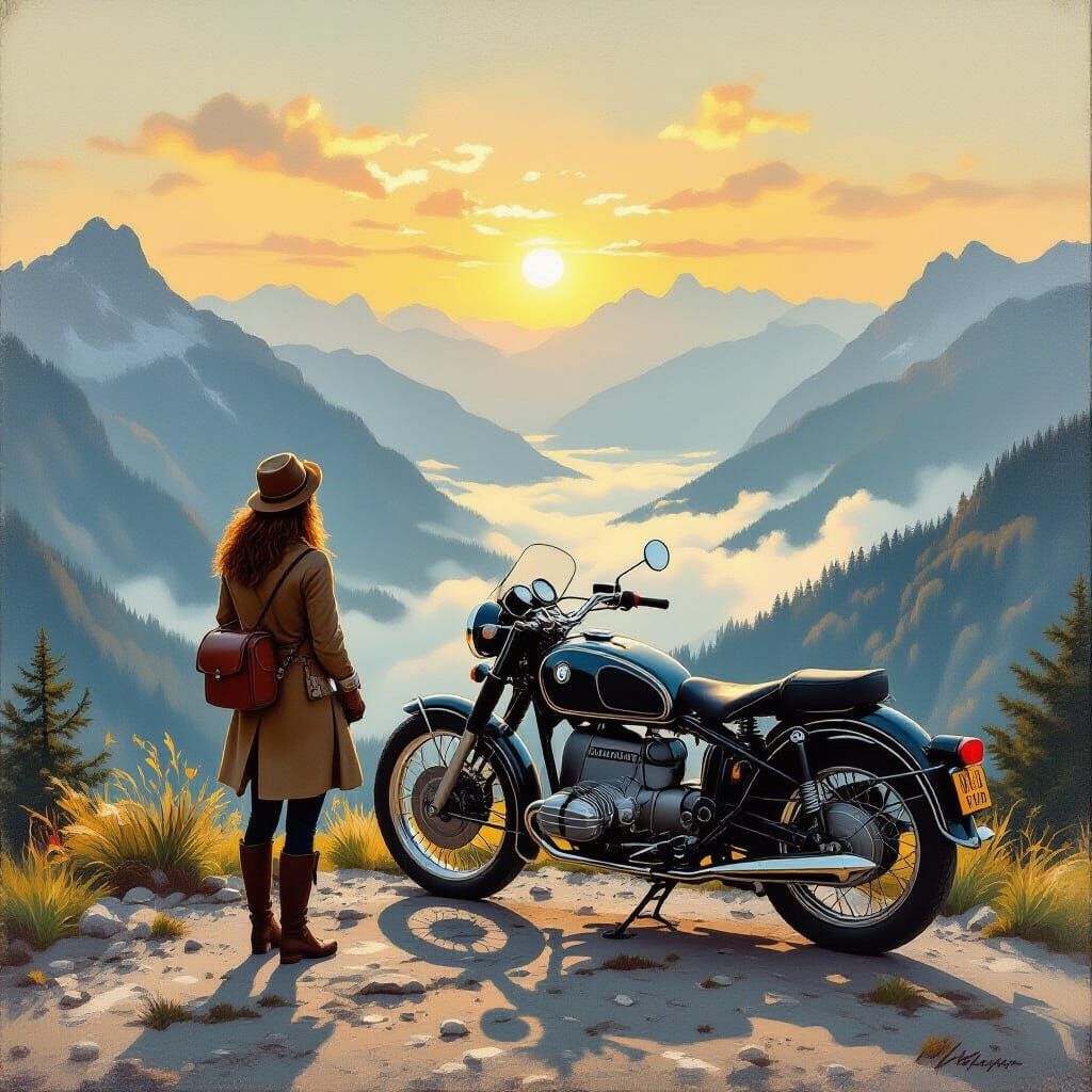 This image shows a vintage motorcycle parked on a mountain road, with a rider admiring the view of misty valleys. It's rendered as a romantic landscape, with golden light and soft brushstrokes, in the style of 19th-century German painting.