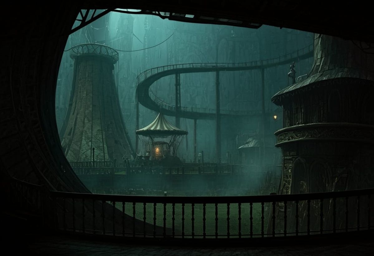 A digital painting of a mad scientist's secret lair inside a decaying Victorian amusement park. Features eerie, glowing equipment and a blend of steampunk and horror aesthetics.