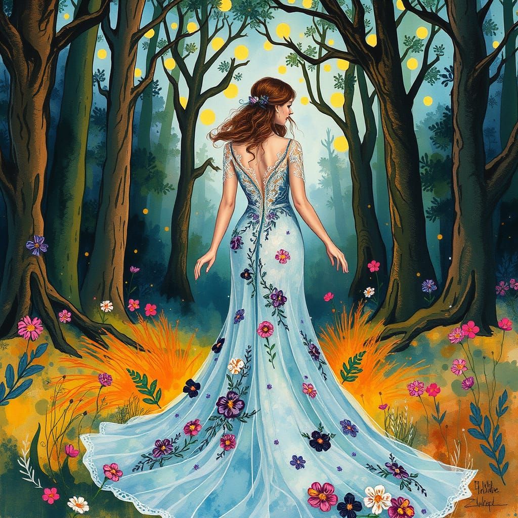A striking picture of a woman in a flowing gown walking into a whimsical forest. The image is rendered in an alcohol ink splatter style, with blended colors and organic textures.