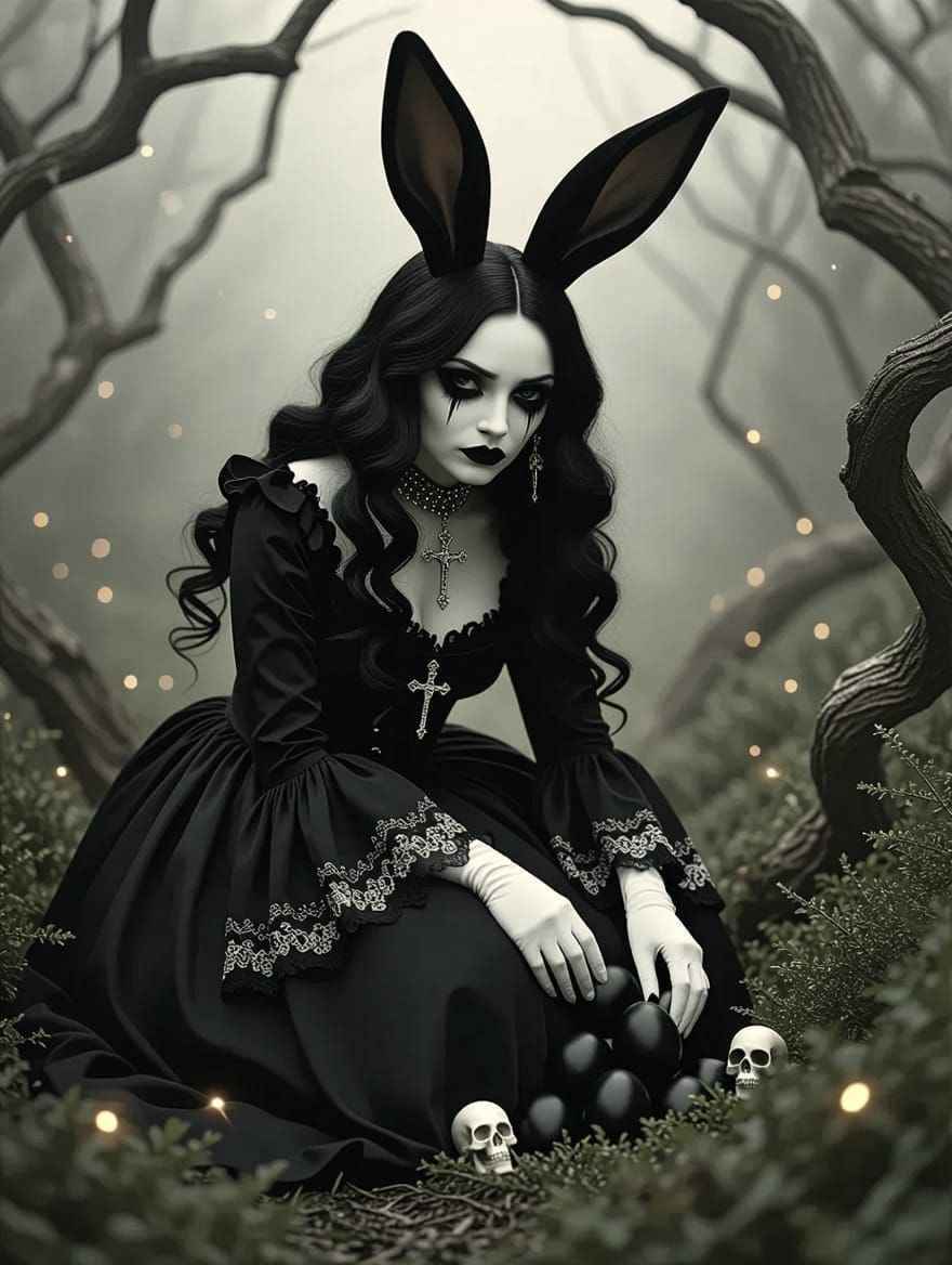 This image captures a haunting Easter Bunny, dressed in gothic attire, searching for black eggs in a mystical garden setting.
