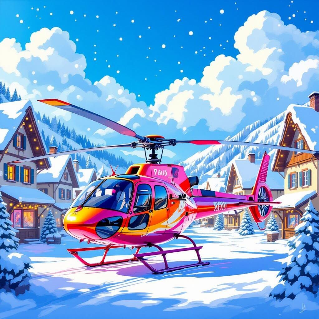 A helicopter is parked in a snowy village square with houses decorated with lights. The picture is painted with bold brushstrokes and translucent watercolor textures, creating a bright and glossy finish.