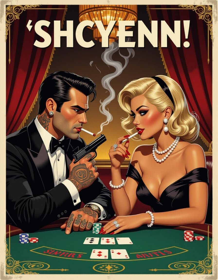 A dramatic image of a tense exchange between a rocker and an heiress in a casino VIP lounge. The scene features chiaroscuro lighting, amber accents, and a noir aesthetic.