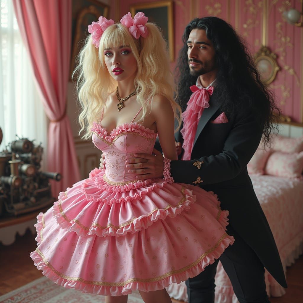 A striking image of a delicate, prissy woman in a lavish, lacey bedroom, surrounded by pastel colors and frills, with a powerful Mafia boss holding her waist, creating a striking contrast between her bright, girly appearance and his dark, masculine presence.