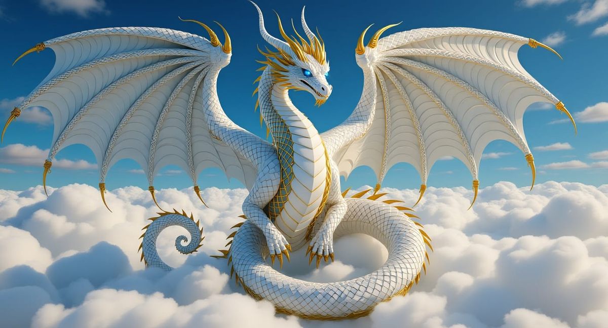 A breathtaking sculpture of a dragon woven from white, gold, and blue wire. The dragon features coiled tails and symmetrical wings, set against a backdrop of white clouds in a detailed matte painting style.