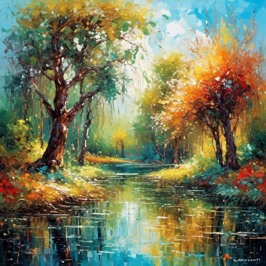 A vibrant neo-impressionist painting of nature. Thick layers of textured paint bring a colourful, expressive feel to this smooth post-impressionist acrylic artwork.