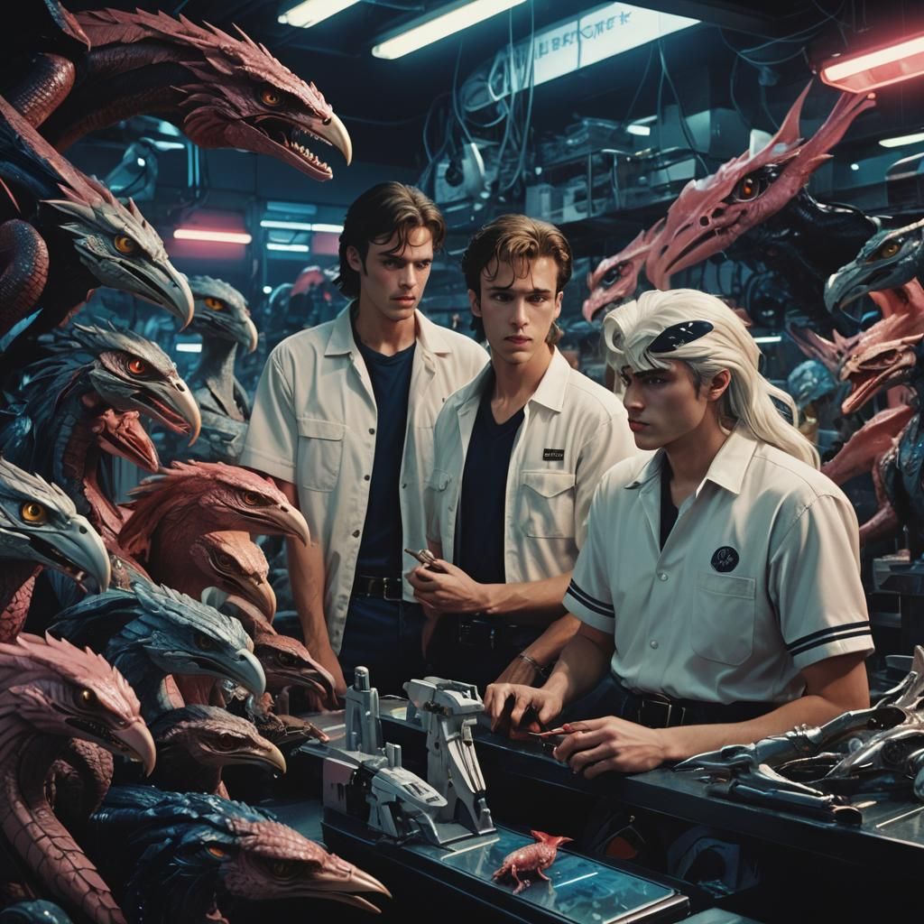 A medium shot shows a shop called Falcon Factory filled with animoid raptors. Sailor Moon-inspired Sheoldred observes from the shadows in a neo-futuristic, industrial sci-fi aesthetic.