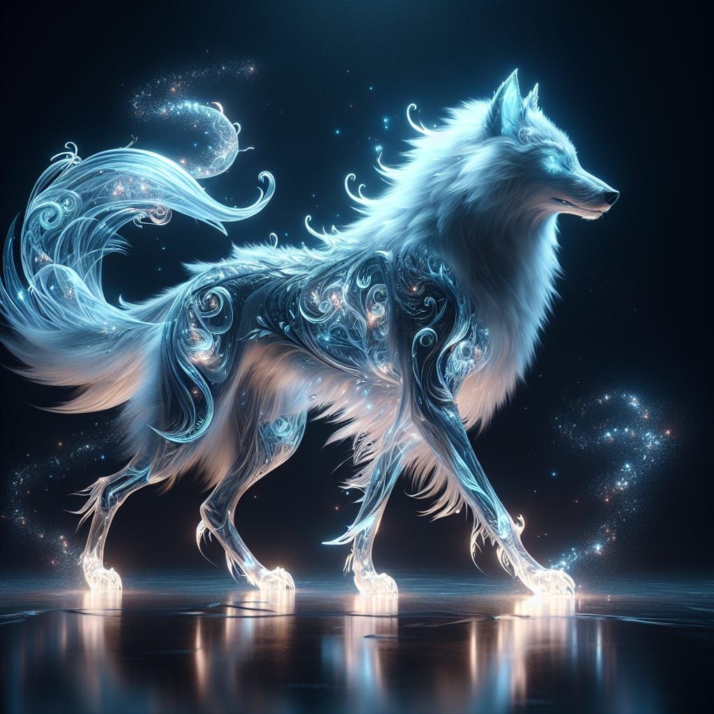 A striking picture of a radiant wolf walking in darkness. The wolf's translucent fur is made of light, adorned with tribal markings. Sparkling particles float around it in an ethereal, hyperrealistic fantasy scene.
