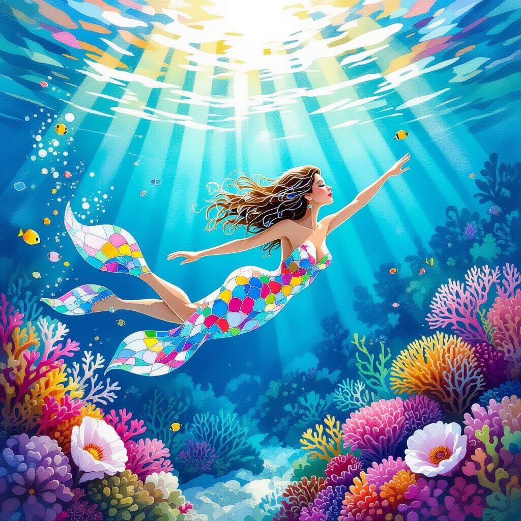 This image shows a woman composed of colorful sea glass swimming in a coral garden. Rendered as a detailed watercolor painting with saturated colors and soft blending.