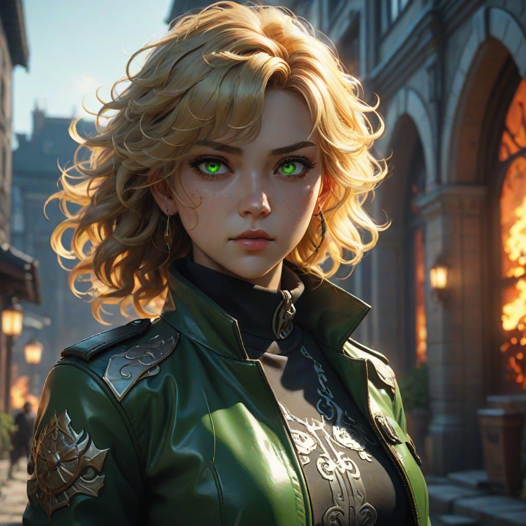 This image shows a fierce woman with curly blond hair and green eyes, dressed as a mafia boss. The anime-inspired 3D art features a fiery explosion illuminating her face in a dynamic digital style.