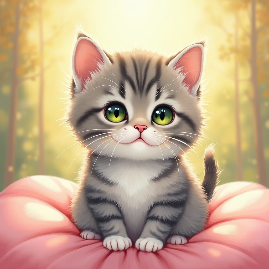 A delicate watercolor-inspired image of a grey and white kitten surrounded by soft pastel hues and warm golden light, blending traditional and modern artistic styles for a dreamy, whimsical effect.