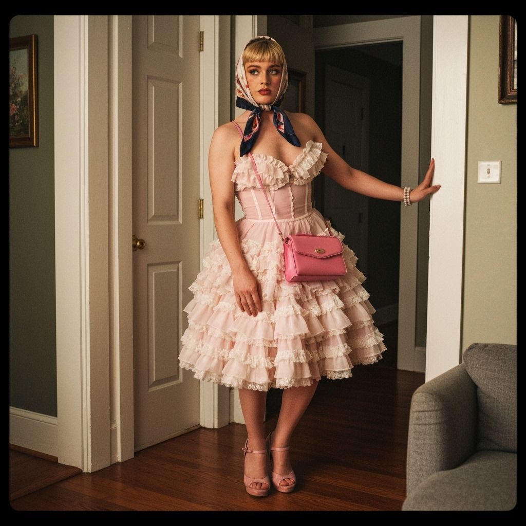 Cinematic film still of a young man with short blond hair, wearing a frilly vintage bardot dress, light makeup, and a pink purse. He's answering the door in a living room, captured with film grain and atmospheric lighting.