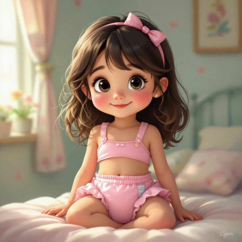 This image depicts a young girl in a pink diaper, rendered in a whimsical art style with soft pastel colors and playful character design. The lighting is diffused, creating a warm and innocent atmosphere.