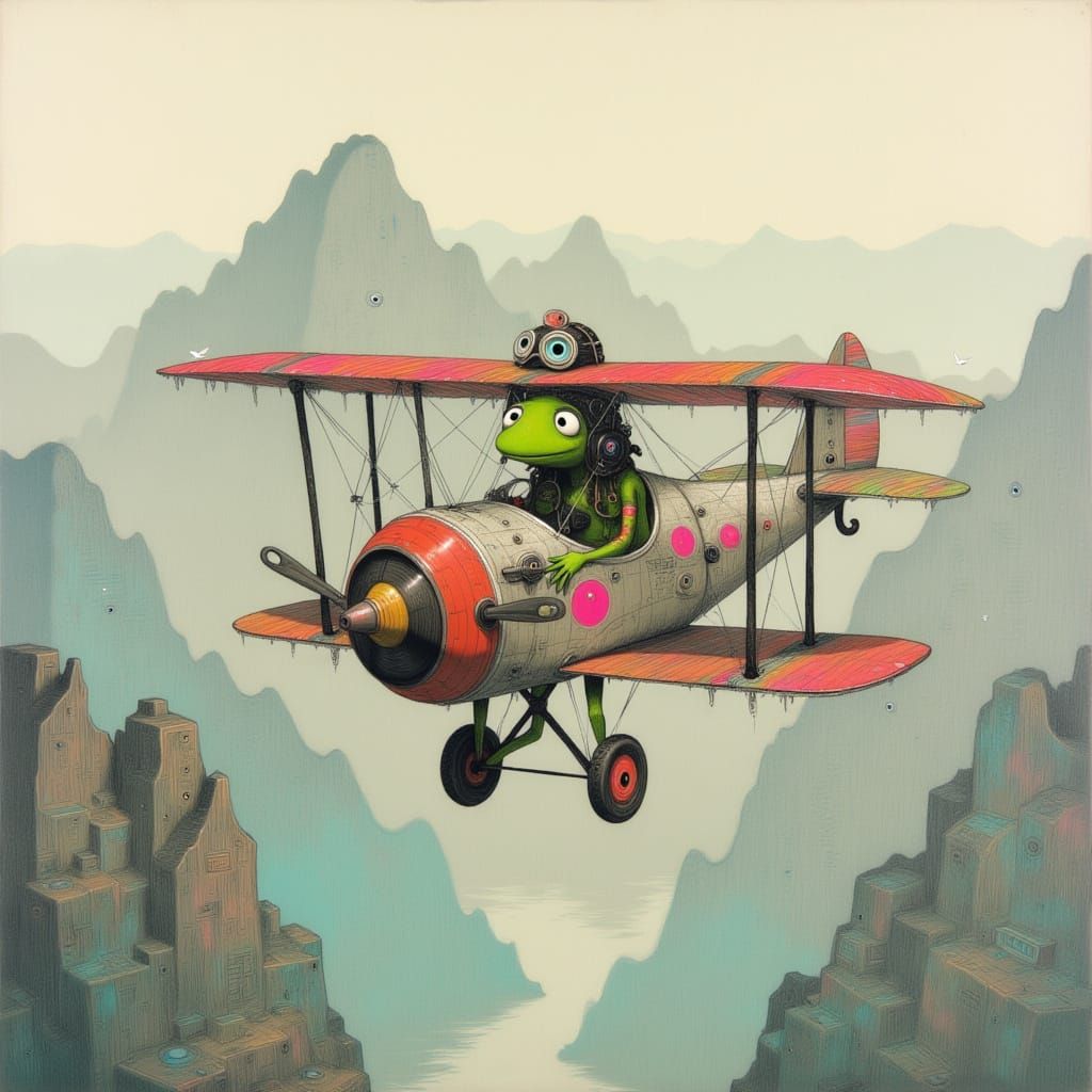 This image shows Kermit the Frog as an aviator soaring over mountains in a vintage biplane. The artwork blends liminal space elements with soft pastel colors in a whimsical watercolor style.