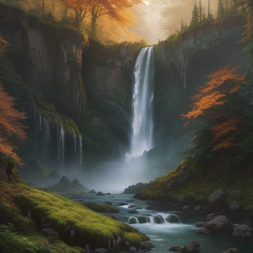 This digital painting captures breathtaking autumn waterfalls cascading down mossy cliffs, illuminated by ethereal light and surrounded by vibrant foliage. Moody, atmospheric lighting creates a serene mood.