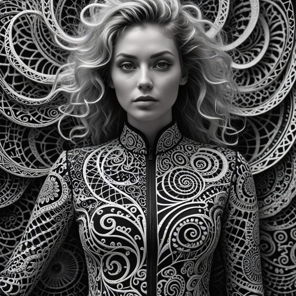 This image shows a woman depicted in zentangle art. The close-up macro photograph features spiral patterns on her clothes and hair, set against an ethereal background, rendered with intricate black and white lines.