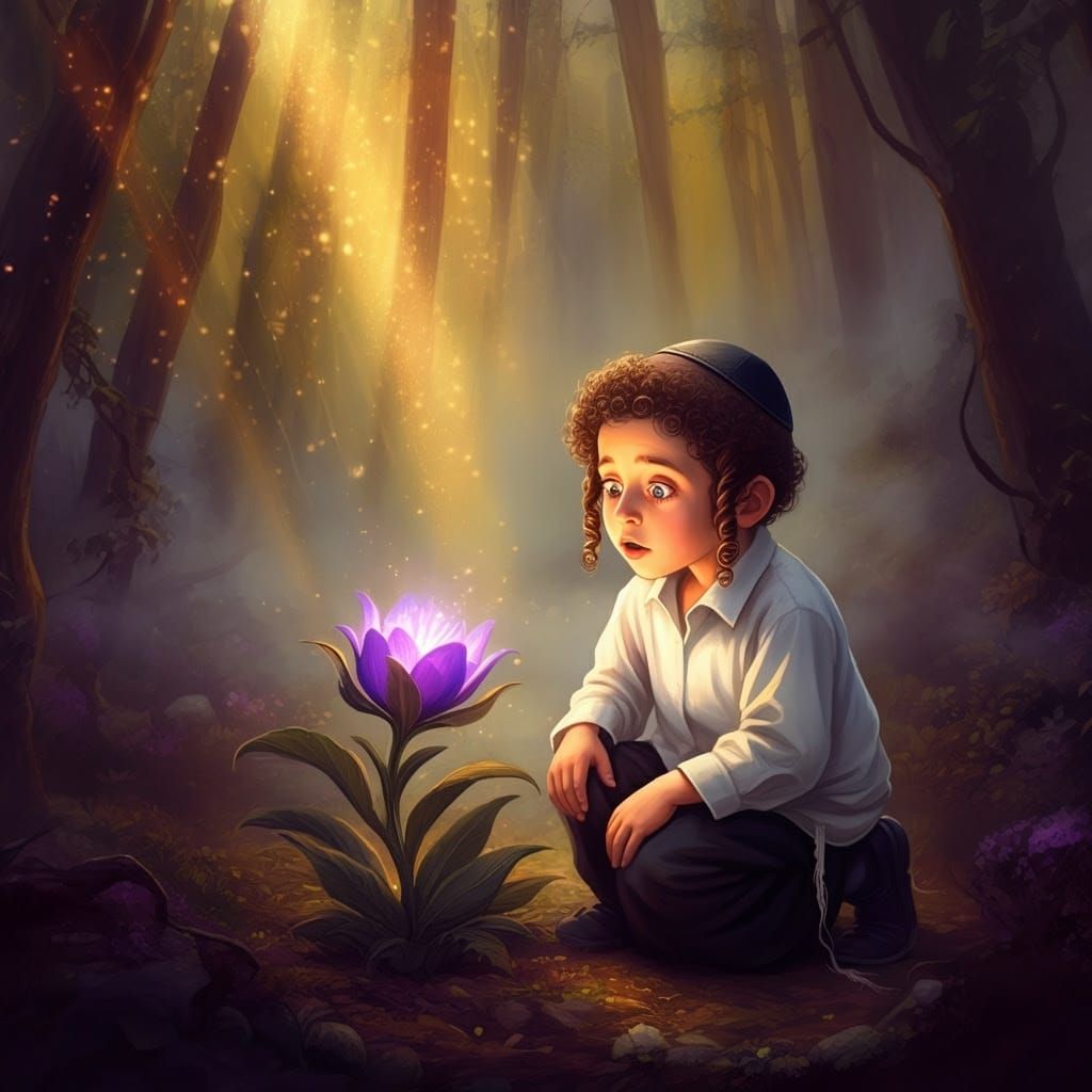 This image shows a young boy from a traditional Jewish community in a mystical forest, surrounded by magical light and nature. The artwork features soft brushstrokes and delicate textures, reminiscent of dreamlike, cinematic scenes.