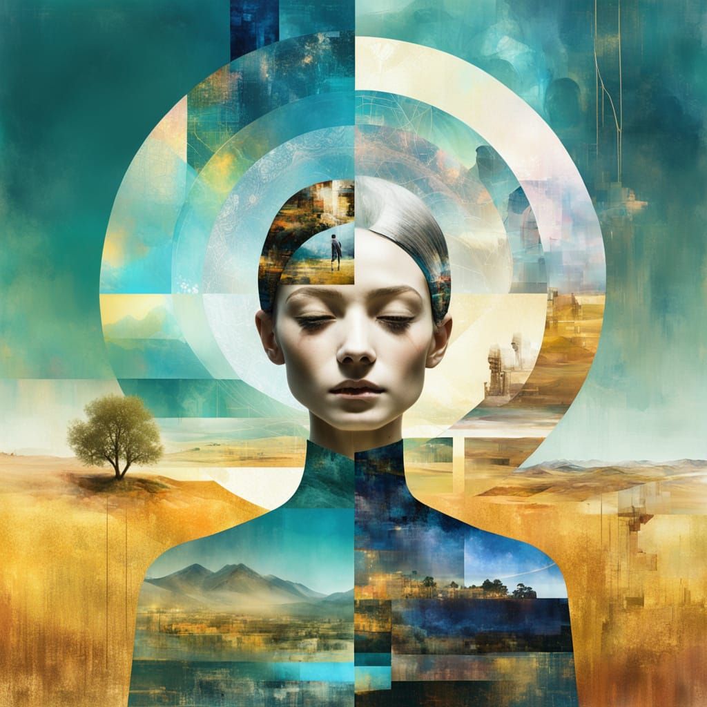 This image features a surreal double exposure, blending photography and collage elements. It captures a minimalistic, golden hour scene with cosmic daydream portal accents.