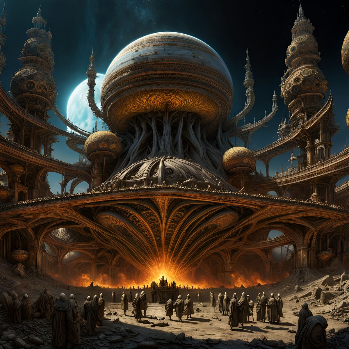 massive destroyed ruined swarm of gigantic golemesque gigeresque ancient unknown culture unknown creatures from deep space statues on distant planetoid psychedelic art crisp details colorful intricately detailed 8K resolution volumetric lighting masterpiece insanely detailed painting hyperdetailed Unreal ...