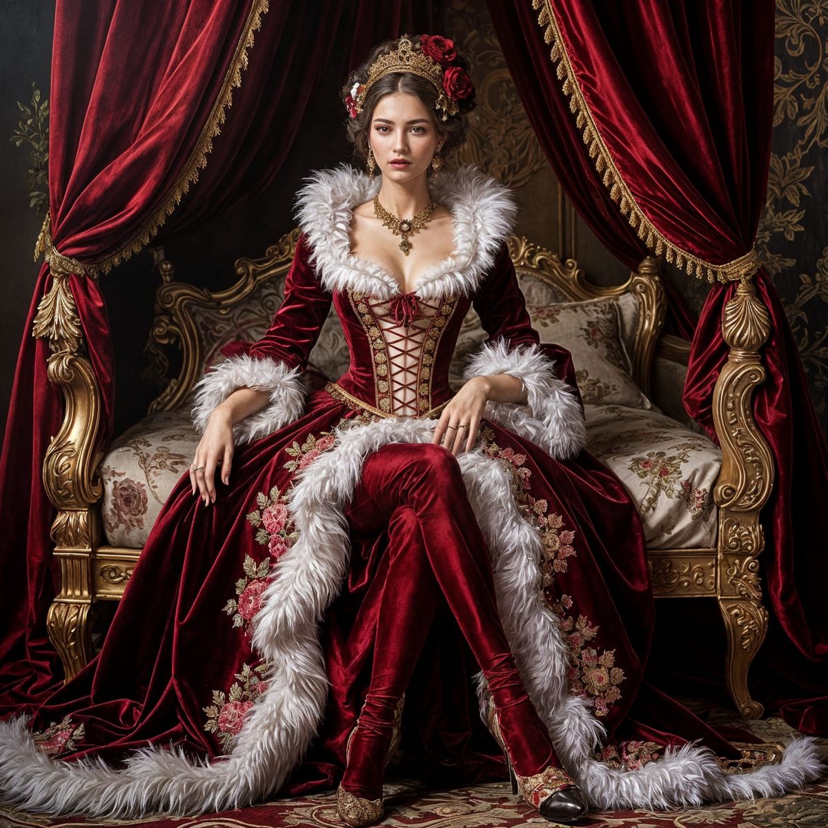 This image shows a furry, feathered noblewoman in a crimson velvet gown with gold embroidery. The portrait exhibits dramatic chiaroscuro and impasto techniques, reminiscent of Flemish Baroque masters.