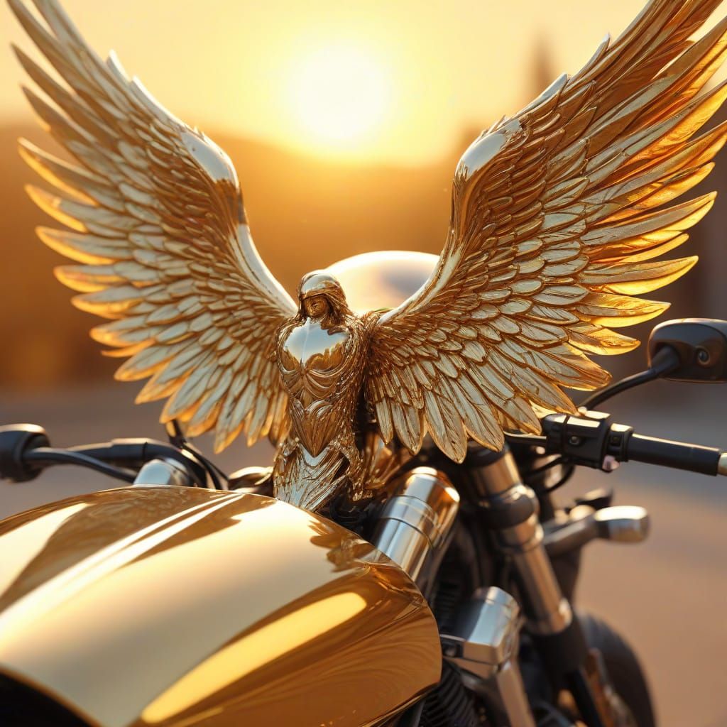 This image shows an angel riding a superbike in a close-up, macro shot. The Byzantine-style digital painting features iridescent wings, golden light, and a soft bokeh background in warm sunset colors.