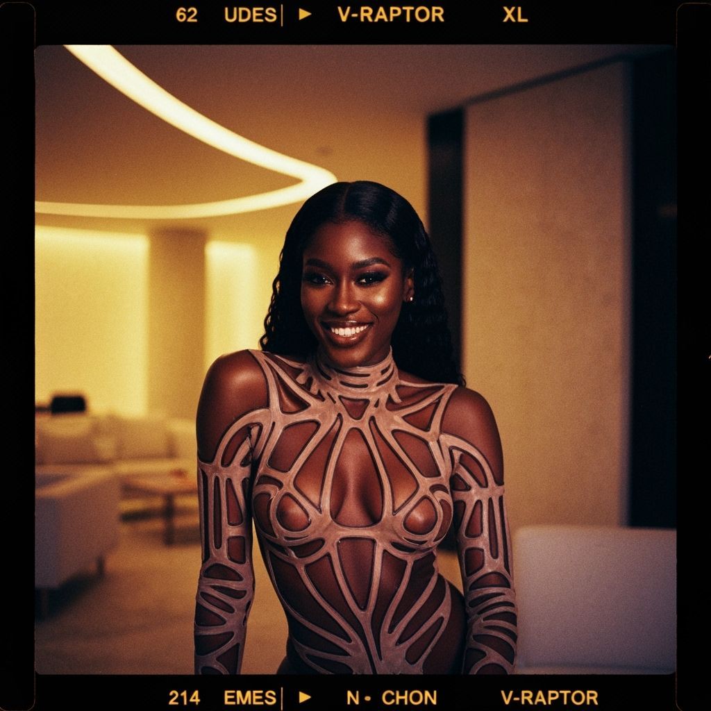This image shows a smiling, dark-skinned woman in abstract clothing. The scene is set in a modern interior with cinematic lighting, creating a dramatic effect reminiscent of photo-realistic film stills.