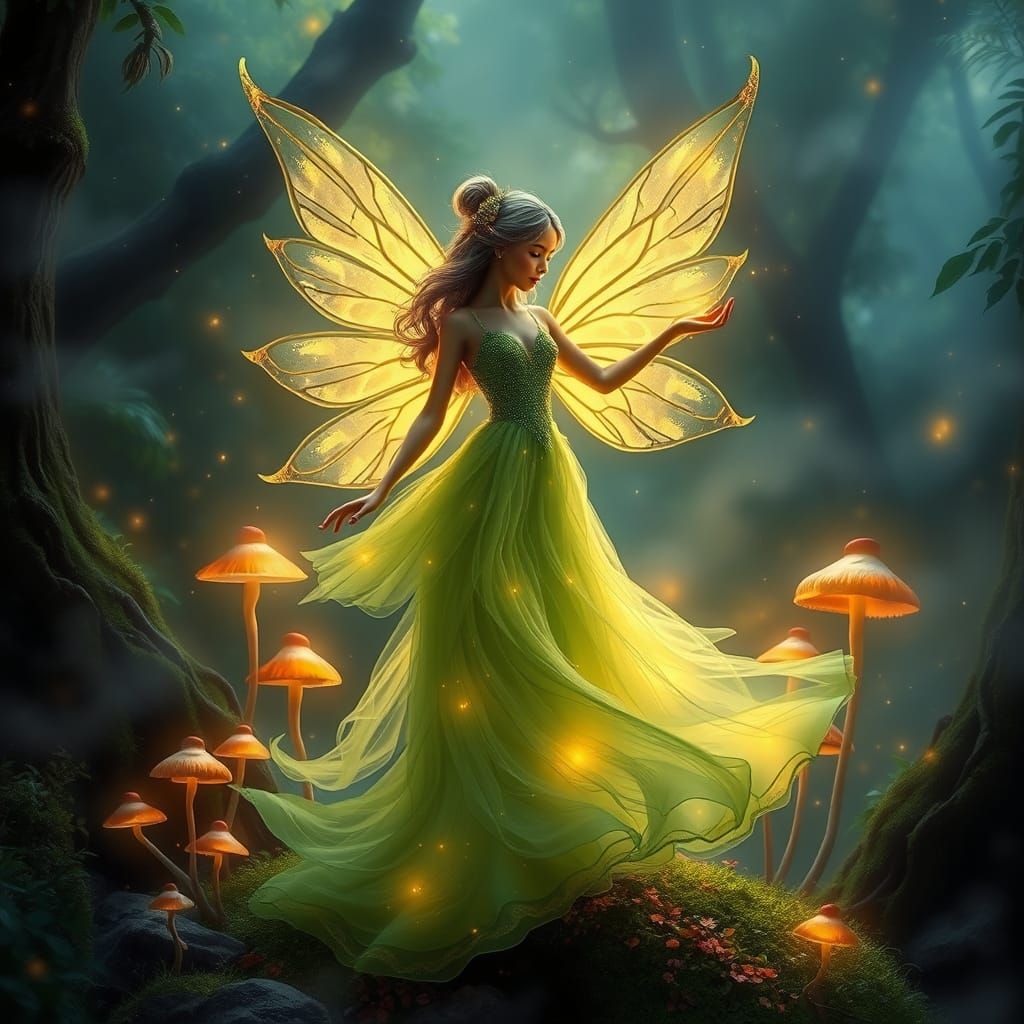 A mystical fairy with petal wings dances among glowing mushrooms in a misty rainforest, evoking warm, detailed, and dreamlike fantasy art.