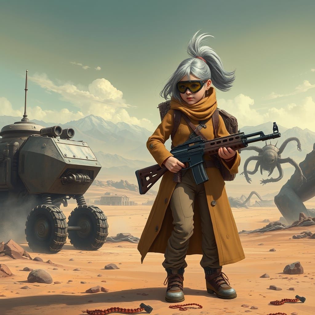 This image shows a young female warrior standing amidst a desolate wasteland, surrounded by ruins and a massive armored vehicle, with a monstrous creature in the distance. She wears a sand-colored coat and protective gear, holding a sci-fi shotgun, in a desertpunk style with intricate details and soft li...