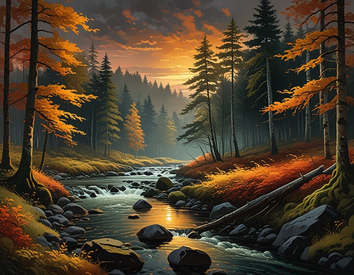 This image shows a mossy riverbank in an autumn forest at dusk. The gouache painting features thick brushstrokes, vibrant colors, warm lighting, and a moody, dark sky in an impressionistic style.