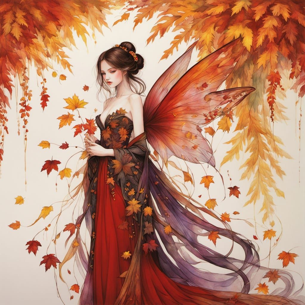 This image shows a mystical panda fairy beside a waterfall in a vibrant autumn scene, inspired by flowing line art and ethereal shading.