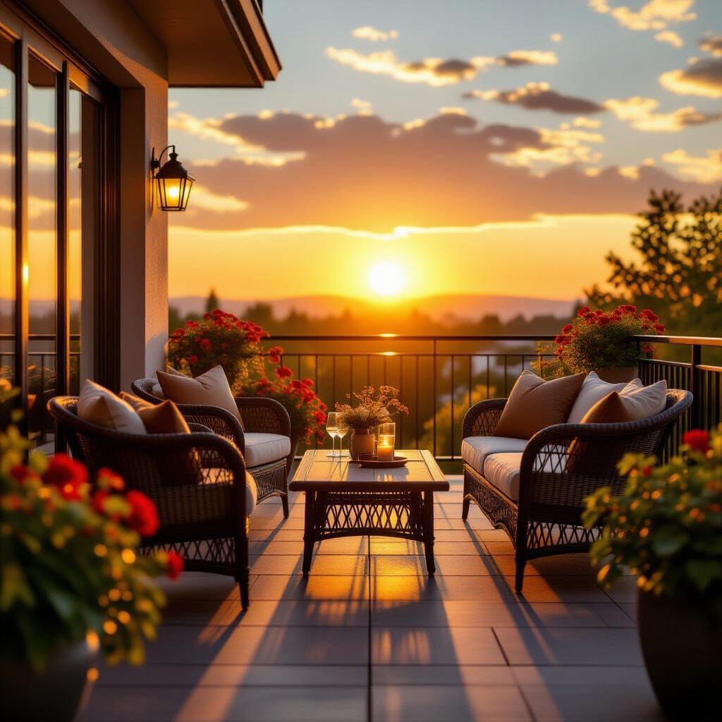 This image shows a realistic 3D rendering of an empty terrace during a beautiful autumn sunset. Outdoor furniture is arranged, bathed in warm golden light.