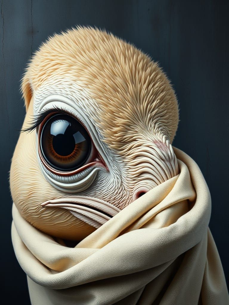 This surreal image features a green eye with intricate details and a cracked, egg-shaped head. The eye is surrounded by weathered fabric with deep folds, set against a dark, blue-green background with a textured, dreamlike quality.