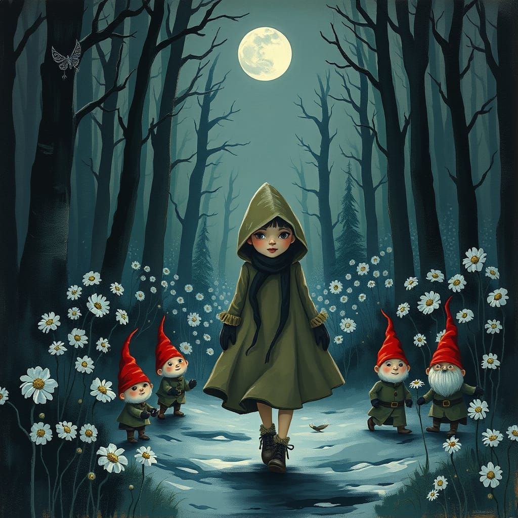 This image shows Snow White, cloaked and mittened, journeying into a snowflower forest with seven gnomes. The scene is moonlit and eerie, rendered in a dark, whimsical style with bold brushstrokes.