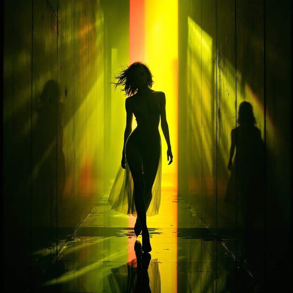This image features high-contrast illumination with bleeding neon halos and deep blacks, evoking a sense of glamorous mischief and elegant distance in an urban setting.