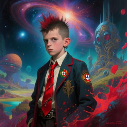 A detailed matte painting of a punk figure, the Galaxy Emperor, in 1970s Portugal, wearing red ties. This fantasy concept art features vibrant colors and an otherworldly atmosphere, rendered in 8k resolution.