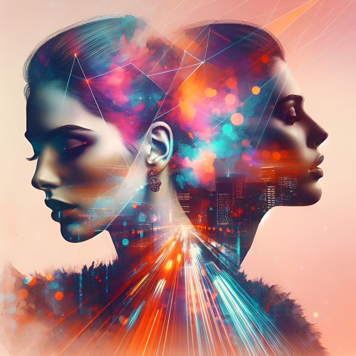 This image is a visually striking double exposure of a cityscape, blending vibrant colors and a portrait, with a focus on shadow and light, creating a captivating and enthralling effect.
