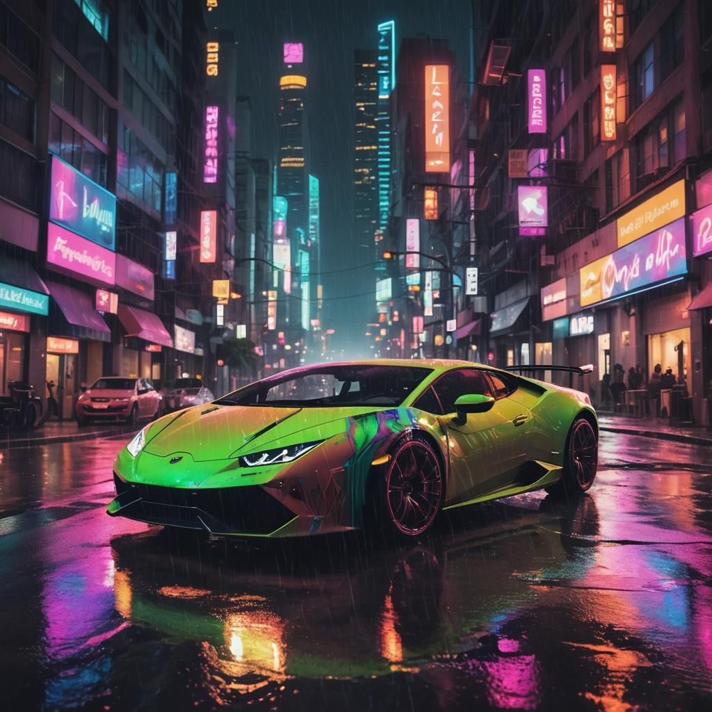 This image shows a Lamborghini Huracan speeding down a rainy city street at night. Neon lights reflect off the wet pavement, creating a vibrant synthwave aesthetic with retrowave glitch effects and 80s-inspired patterns.