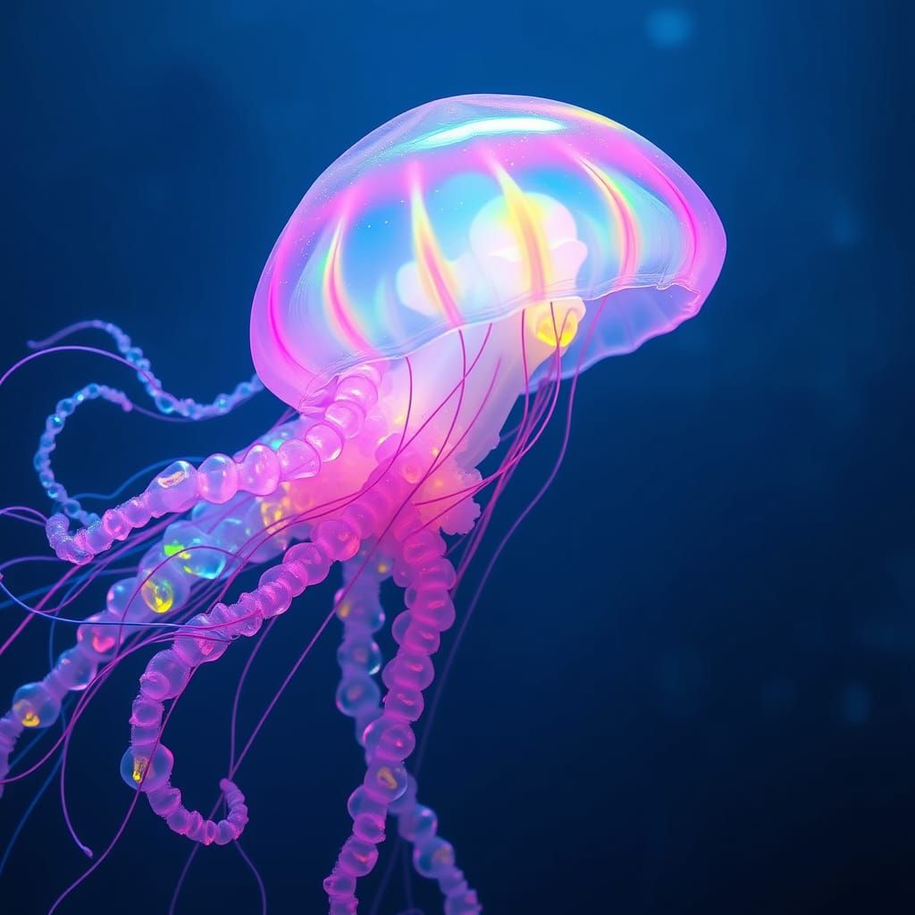 This image shows a surreal, glowing jellyfish with vibrant, rainbow-colored tentacles, set against a dark and mysterious oceanic background, evoking the dreamy, neon-lit aesthetic of cyberpunk art