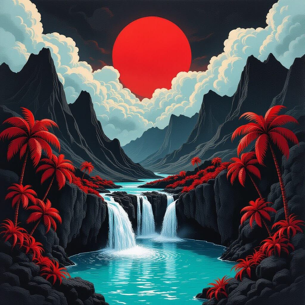 This image shows a surreal Hawaiian landscape featuring black mountains, textured details, and white waterfalls flowing into a turquoise pool. The scene presents fiery palm trees and a crimson sun, set against swirling clouds in a dark surrealist style.
