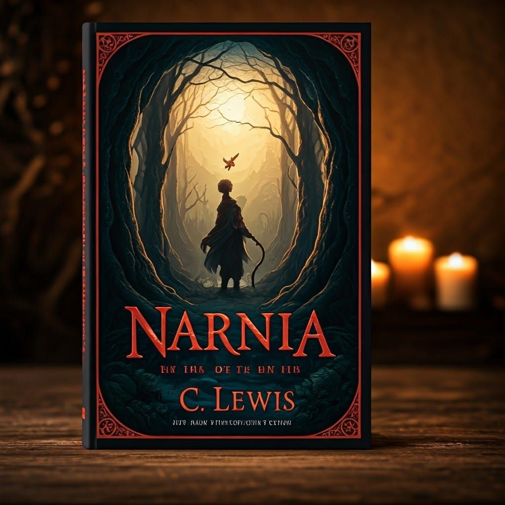 This image is a stunning book cover depiction of C. S. Lewis' classic fantasy novel, Narnia, captured in a warm and inviting color scheme with a shallow depth of field effect.