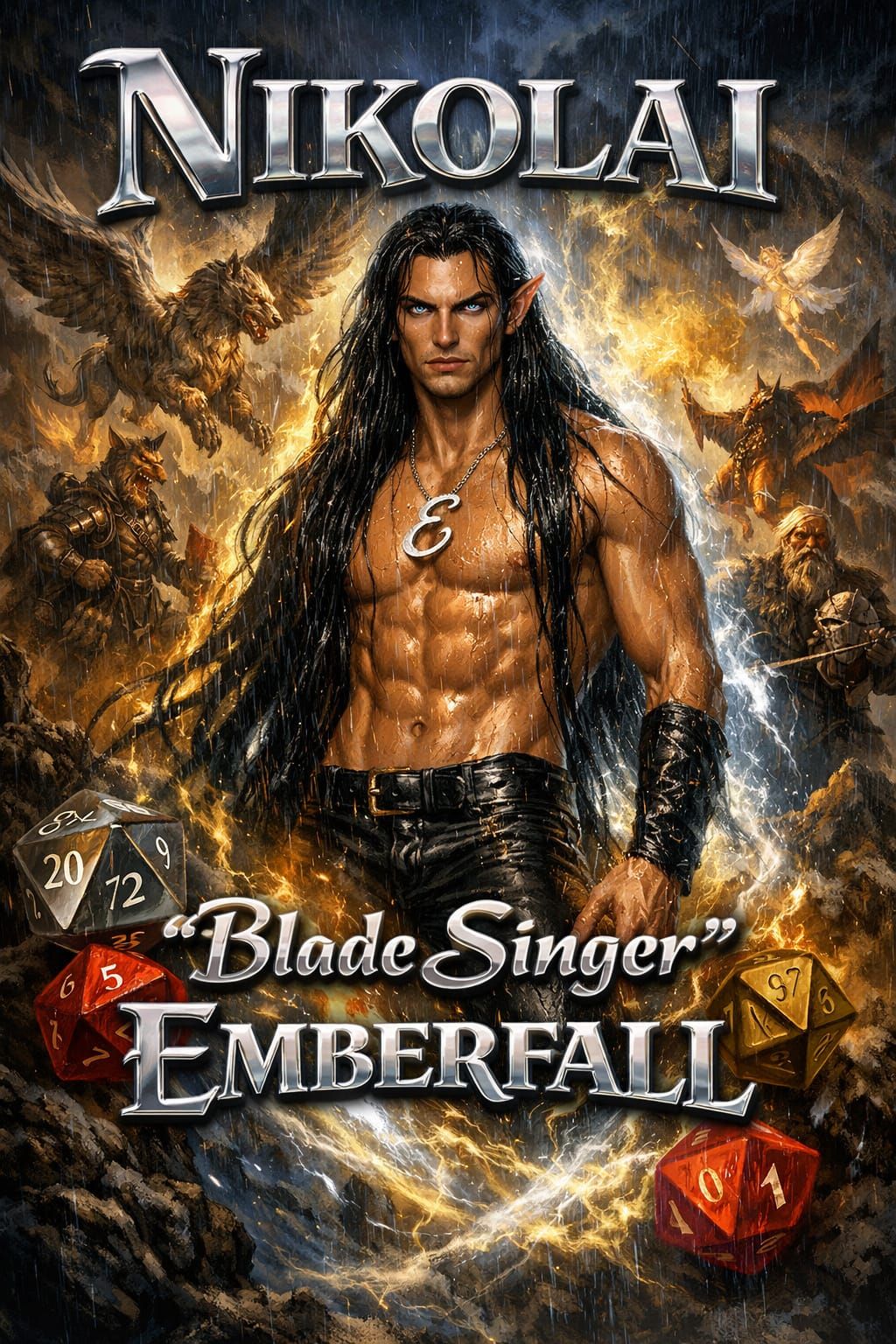 This image features a tanned elven man with long black hair and pale blue eyes, adorned in black leather and a silver necklace. He stands in the rain, surrounded by a vibrant aura and a detailed fantasy background.